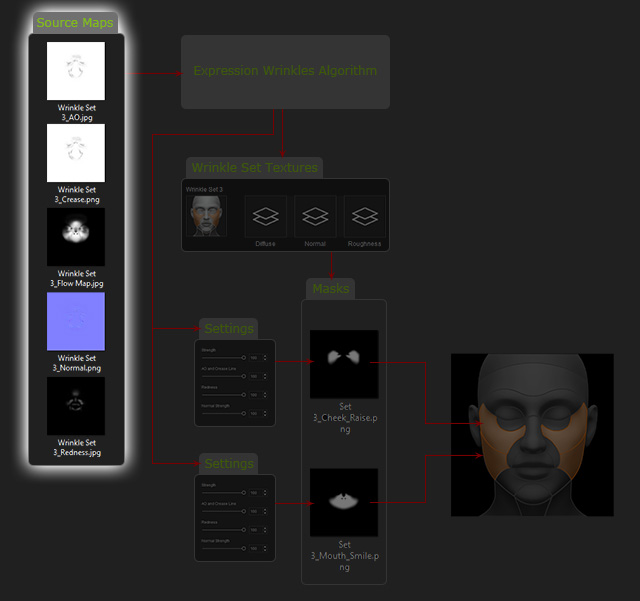 - Flow Map: Controls the timing of the wrinkle patterns when they emerge on the face. Lighter areas appear sooner than dark areas.