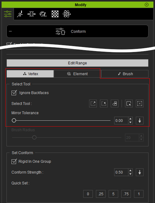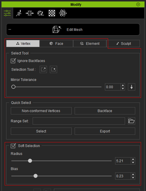 - Ignore Backfaces: Activate this box in order to avoid from accidentally selecting the back faces or vertices.