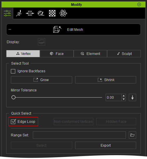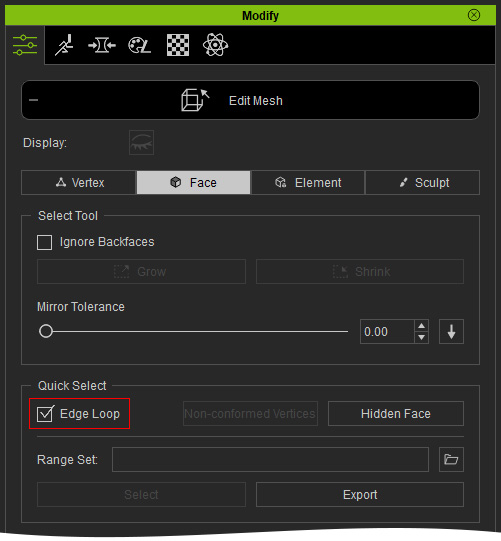 - Switch to the Face mode and activate the Edge Loop checkbox.