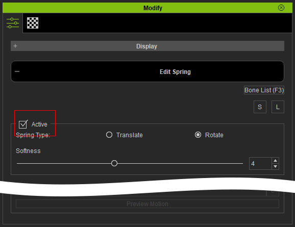 After you apply a spring effect to a bone node (or any extended bones for a character), the node can then start to bounce in a rotational and translational manner. By further adjusting the settings for the node, you can adjust the bounciness.